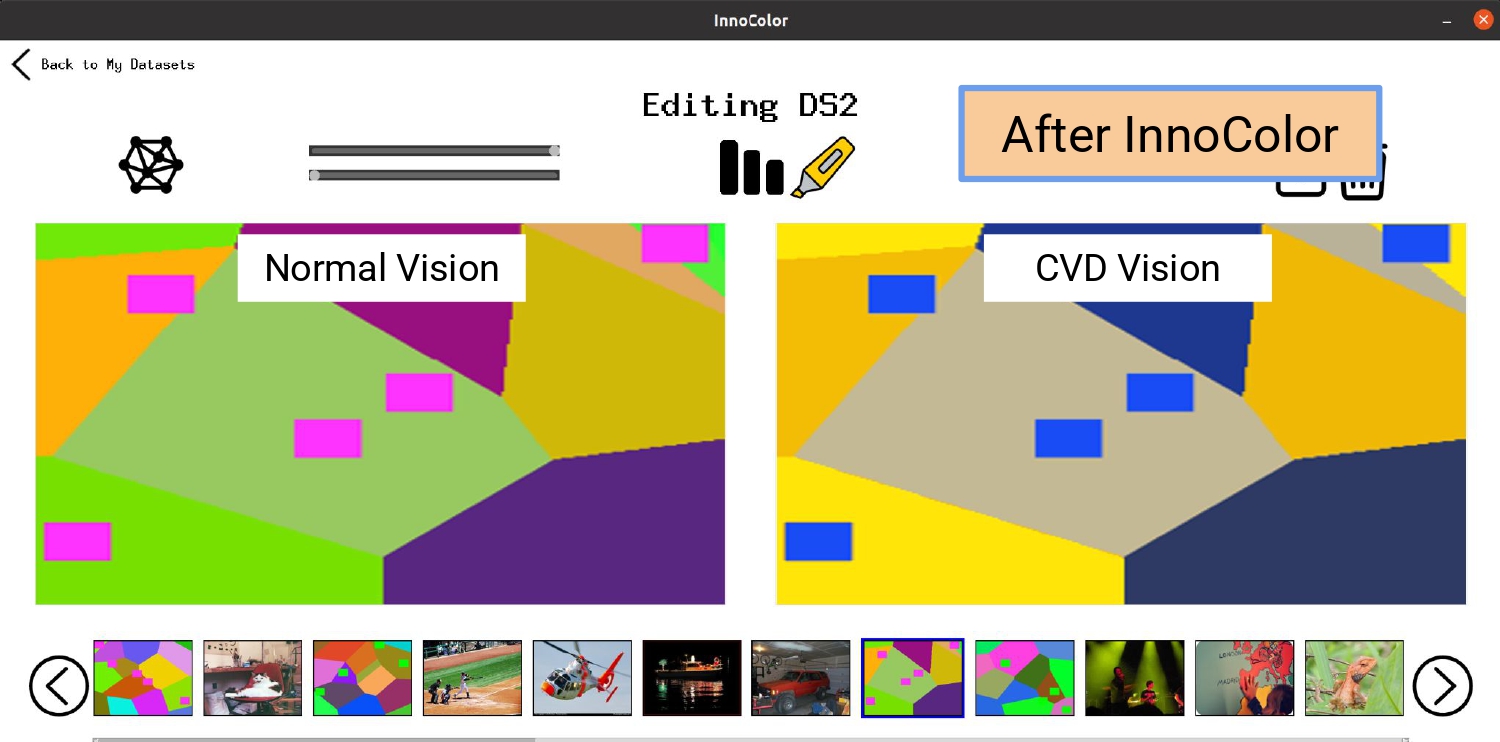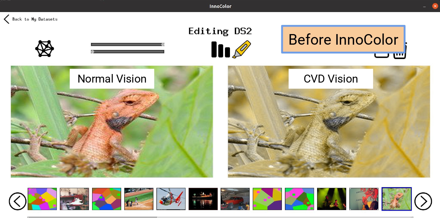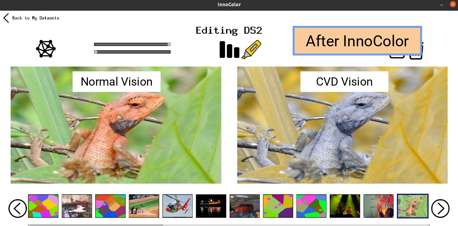 InnoColor utilizes a deep-learning guided image transformation to modify visual content, like images, video, and GUI, in both digital software and physical interfaces.